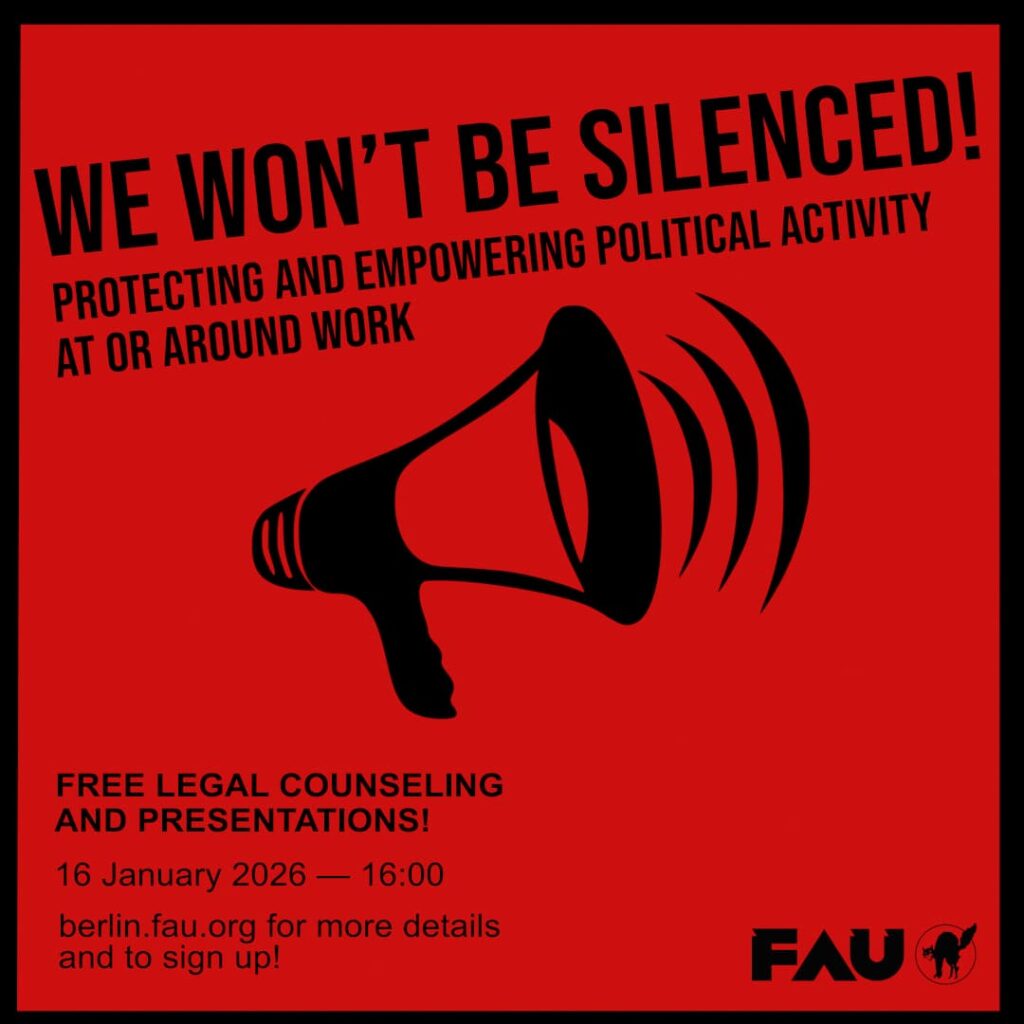 • 16:00 – 18:00. One-on-one free private legal counselling with Rupay Dahm, a lawyer for workers rights (DE/EN). Six available slots of 20 min each. You do not need to be a FAU-member to register. To guarantee your case can be discussed, you need to pre-register and provide details about your case in advance so our lawyer can prepare: Sign up form