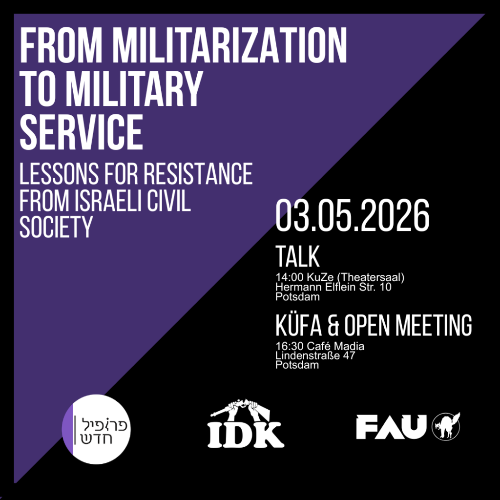 Afterwards, the IDK and FAU invite you to a KüFa (community kitchen) and an open meeting to discuss possibilities for resistance to militarization. The IDK (Internationale der Kriegsdienstgegner*innen), like New Profile, is a section of War Resisters International and supports and advises conscientious objectors. As a grassroots union, we want to discuss together with the IDK what resistance to military preparedness can look like, what role the labour movement plays in it, and how we can liberate ourselves collectively.